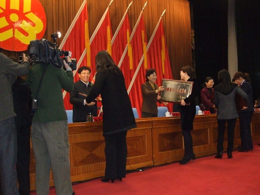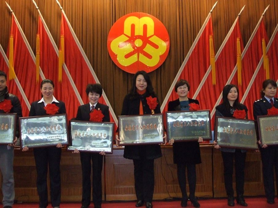 我校外国语学院公共外语系被授予“安徽省三八红旗集体”荣誉称号。表彰大会上,系主任冯茹老师作为集体获奖代表,从孙金龙手里接过奖牌。据悉,今年全省共有10家单位获此荣誉称号,我校是全省教育系统唯一获此荣誉的单位。这是外国语学院公共外语系继2011年 “淮南市巾帼文明岗”后获得的又一殊荣。领奖归来,冯茹老师回到学院,被老师们簇拥问候,她表示:“外国语学院广大女教职工将以此为鞭策,努力工作,拼搏进取,为学院和学校的建设和发展建功立业。”