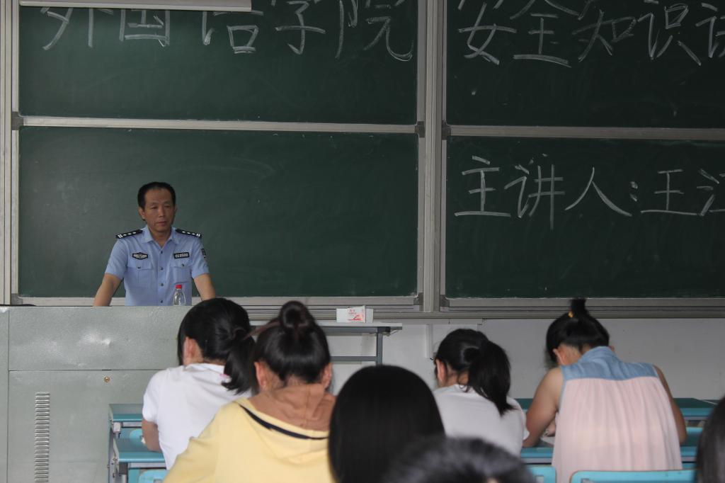 6月14日下午4点,外国语学院邀请西区保卫科科长王江平在西区医教101教室为大一新生做安全知识讲座。院党委副书记程秀霞、学生辅导员以及全体大一学生听取了此次讲座。