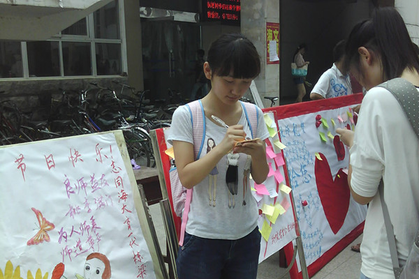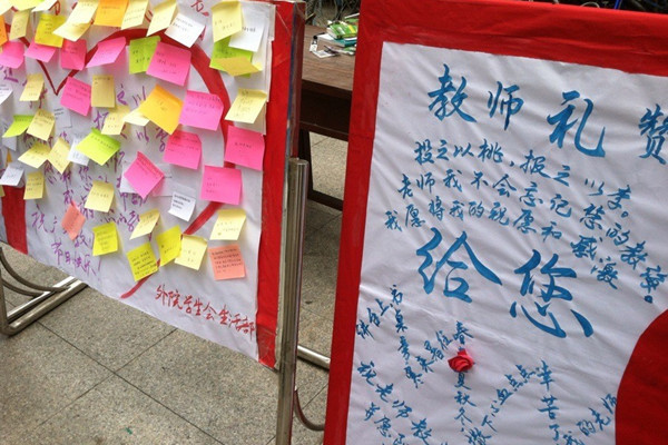 又是一年九月,又是一年教师节。9月10日清晨,外国语学院办公楼的展板上“教师礼赞”、“我愿将我的祝愿和感激给您”……一句句真诚的话语,一段段感人的祝愿,布满着学生们对老师的节日祝福。在这个特别的日子里,外国语学院的学子们用便利贴、短信、QQ、微博、电话等方式向教师们表达着深深的感激之情和浓浓的祝福之意。