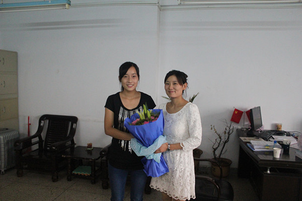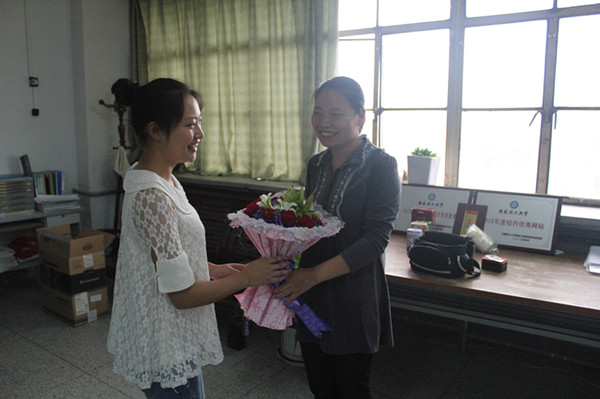 9月10日下午,外国语学院办公室。2011级学生王菲、陈云云代表11级全体同学向美国文学课任课老师方海霞、高级英语任课老师葛小颖送上鲜花与拥抱,感谢老师们孜孜不倦的教导,传授专业知识,叮咛做人之道。鲜花绽放,我们的青春因为老师们的引领而更加绚烂多姿。