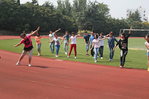 9月15日早上,外国语学院2013级全体新生在西区操场举行素质拓展活动,四位年轻的班主任们全部参与,跟同学们一起分享青春和快乐。两人三足接力跑、数字对对碰、谁是卧底,一个个有趣的小游戏,不仅让新同学之间抛开拘束,甩走羞涩,更拉近了师生之间的距离,让同学们进一步感受到班主任的亲切与活力。班主任廖华云老师还现场教同学们跳起了舞蹈。九月的运动场上,留下了老师和新生们共同的足迹。