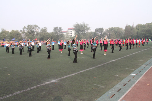 10月24日早上七点,离运动会开幕式还有一个小时。秋风萧瑟,阵阵寒意,但是外国语学院教师刘梅、宋桂霞、刘春荣、杨莉、陈莹莹等十位女老师早早的来到运动场上进行最后的彩排,她们要参加8点钟运动会开幕式广场舞表演。为了这次演出,外国语学院舞蹈队的老师们每天下午三点在学院舞蹈房训练,已经坚持一个多月。开幕式上,她们个个精神饱满、欢欣鼓舞,随着欢快的节奏翩翩起舞。整齐的动作、优美的舞姿,昂扬的精神状态赢得了观众们的阵阵掌声和喝彩,充分展示了女教师们积极向上的精神面貌。