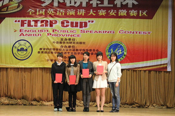 10月26日至27日,2013“外研社杯”全国英语演讲大赛(安徽赛区)复、决赛在安徽大学拉开帷幕。外国语学院英语11-4班孔健梅与古雪茹2位同学代表我校参加比赛。经过激烈角逐,两位选手不畏强手,突破自我,均摘得大赛二等奖的优异成绩。我校指导教师程仲获“优秀指导教师”奖。