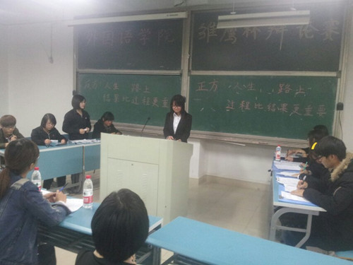 此次辩论赛参赛队员是13级英语二班和英语三班代表队,辩题为“人生路上,过程与结果谁更重要”。正方英语三班坚持过程作为结果的基础,过程更为重要,人们应该享受过程而不是瞩目结果,而反方紧抓结果是一系列过程的最终目的,结果具有导向性等几点进行反驳。在自由辩论时间里,正反方抓住对方漏洞,展开激烈的唇枪舌战,语言犀利,直戳重点,台下观众掌声不断。程秀霞公布了比赛结果,并对本次比赛做总结点评,她对同学们的表现赞赏不已,鼓励在座的新生们多思多想,提高语言和思辨能力,增强综合素质,展示辩论风采。