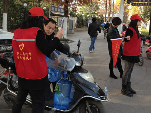 活动得到了淮南市公安局交警二大队工作人员的大力支持。上午九时,志愿者们穿上制服拿上指挥旗,在交警的悉心指导下,在十字路口协助交通指挥,告诫行人红灯等待,绿灯才能安全通行。还有一些志愿者则驻守在红绿灯处,向过往的路人发放宣传单,宣传安全知识,讲解安全注意事项。虽然路人们都步履匆匆,但还是停下脚步耐心地听取志愿者们的交通安全知识宣传,并纷纷表示赞许。