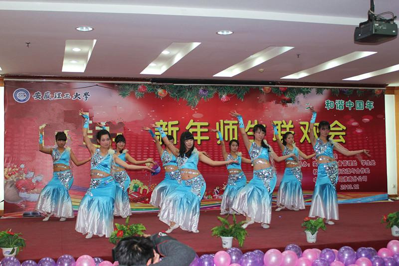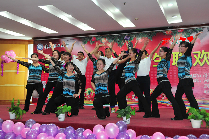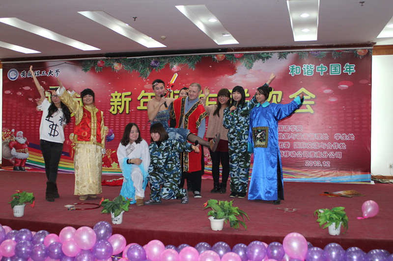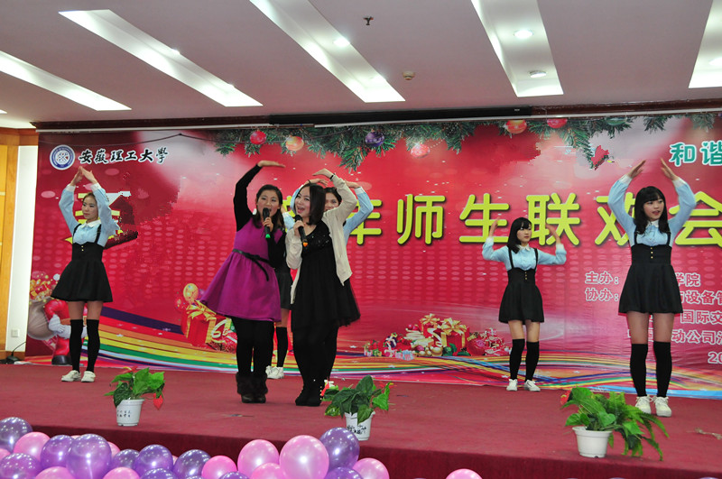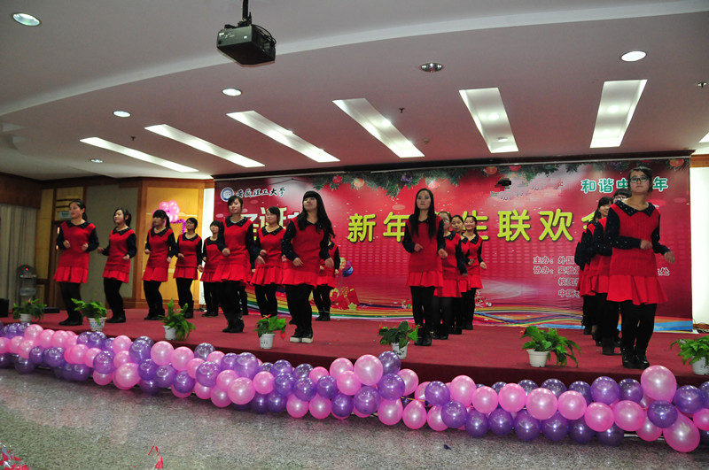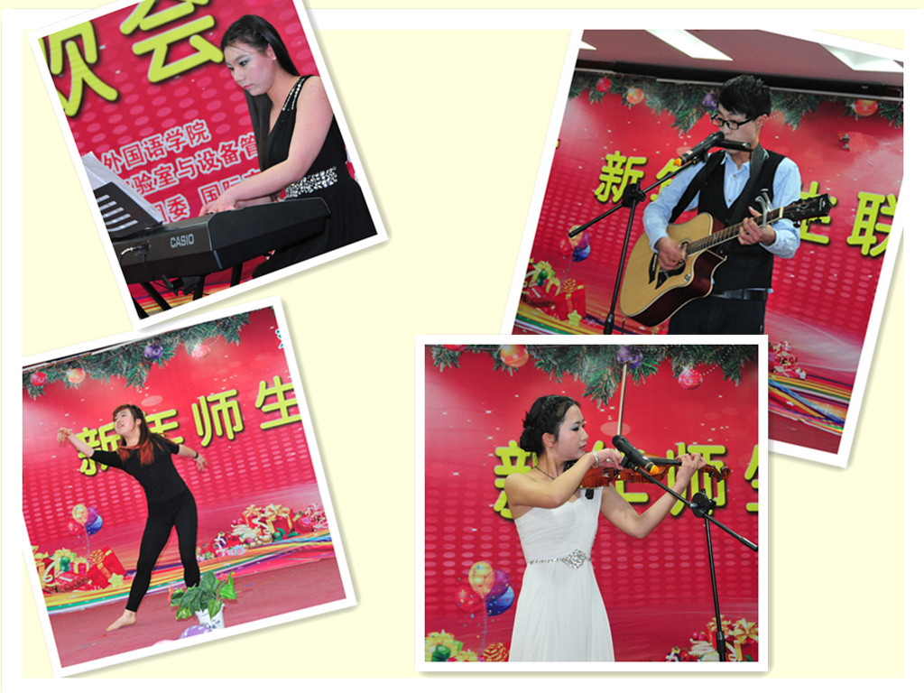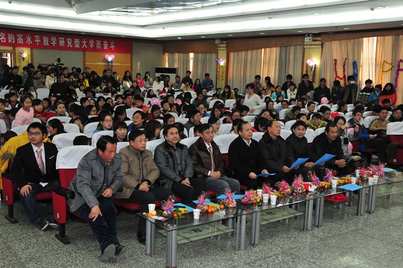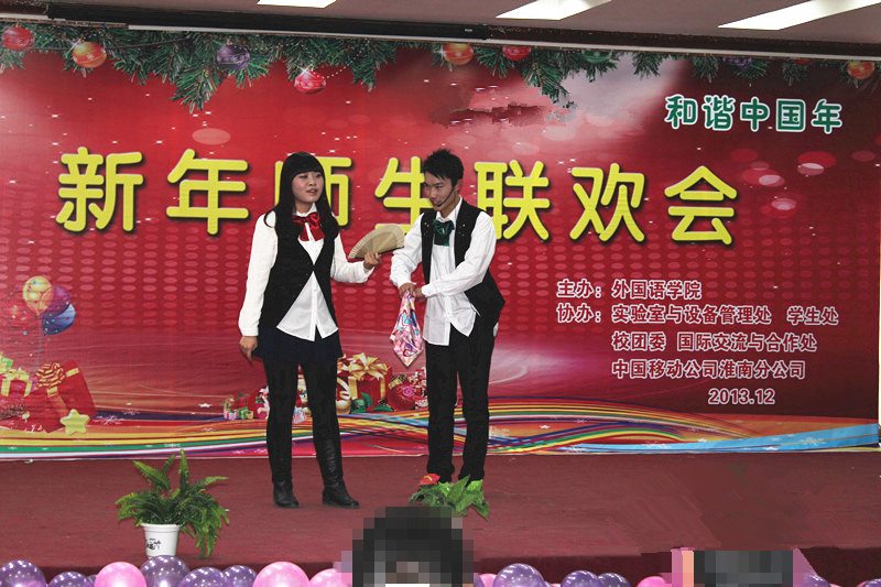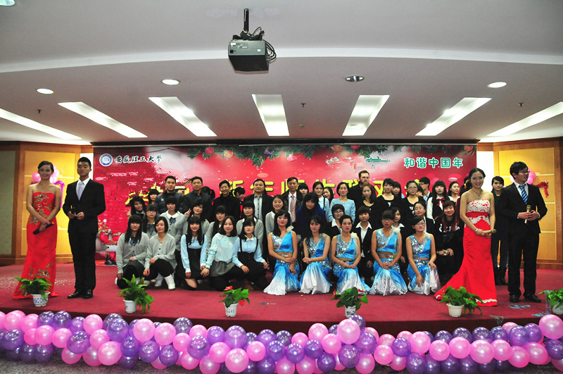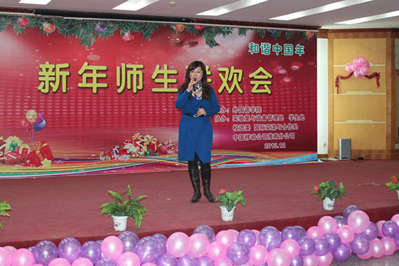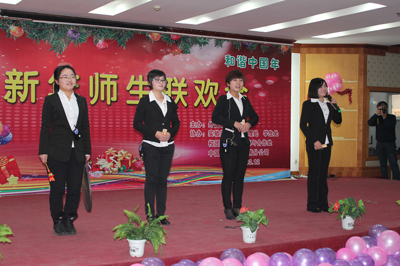 2013年12月27日下午3:00,外国语学院迎新年师生联欢会在本部九楼报告厅举行。校长郭永存、副校长叶醒狮莅临现场,与外国语学院师生共度欢乐时光;校党政办主任张海军、就业处处长吴照明、国际交流与合作处处长梁星、学生处处长田中良、校团委书记王先江等职能部门负责同志,与外国语学院师生一同观看了演出。