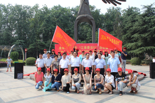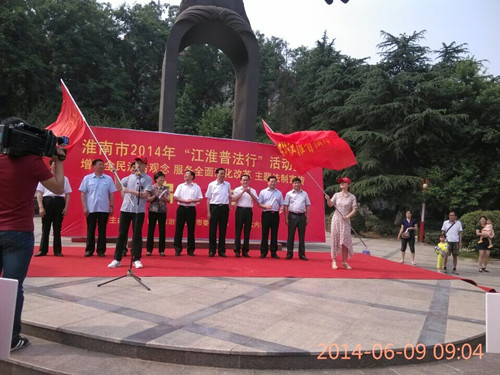 淮南市2014年“江淮普法行”包括“普及行”、 “宣传行”、 “督查行”三大版块,王玉成在启动仪式上强调,“江淮普法行”活动,是淮南市深入贯彻落实“六五”普法决议,大力推进“法治淮南”建设,积极服务科学发展的重要举措和创新平台,对于推动学法、守法、尊法、用法,营造良好的法治环境,促进我市经济社会的持续健康发展,具有十分重要的意义。要把“江淮普法行”活动与“增强全民法治观念服务全面深化改革”主题法制宣传活动有机结合起来,按照统一部署,精心组织,密切配合,锐意创新,务求实效的要求,把活动不断引向深入。陈儒江、张祖保给外国语学院两名普法志愿者代表授旗。