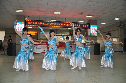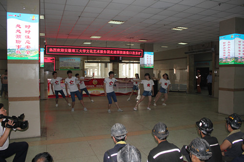 6月份是全国“安全生产月”,22日上午,外国语学院、能源与安全学院的40多名大学生组成文化艺术服务团,走进位于阜阳市颍东区的国投新集口孜东矿,在井口通过歌舞等活泼的宣传形式,送文艺文化大餐给广大辛苦工作的矿工朋友们,让上千名矿工在欢歌笑语中记牢了安全生产的重要性。副校长叶醒狮、校党政办副主任方运纪、校团委副书记赵宁、两学院党委领导与口孜东矿矿长丁家贵、党委书记马纪、总工程师杜库实等矿上领导共同观看了演出。淮南今晚800、淮河早报对活动进行了全程报道。