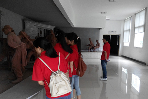 教育馆共分为七个展厅。首先,映入眼帘的是一堵祭奠遇难矿工的的纪念墙,触目惊心的数字在无声中控诉了日本侵略者的残暴罪行。随后,一张张矿区旧照真实的记录了当年淮南矿工遭受日寇掠夺、迫害的全过程。破烂不堪的衣物、粗制滥造的生活用具、逼真展现矿工工作情况的雕像更是反映了在日寇残酷剥削下矿工们悲惨无比的生活状况。参观过程中,同学们仔细阅读当时的相关历史记载,观看了当时遇难矿工生平所用的生活、工作器皿,以及破旧的衣物。当来到埋葬遇难矿工的大坑面前时,同学们驻足默哀,为矿工的遇难感到悲伤。出了展厅,同学们随后有又来到关押矿工的水牢进行参观,了解当时日军对中国人民惨剧人寰的迫害。参观结束后,同学们与教育馆工作人员合影留恋。