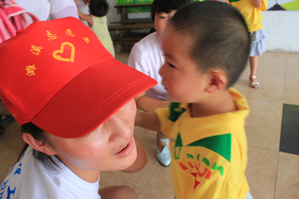 刚一进门,孩子们早已在康复中心门口排成整齐的队伍用热烈的掌声欢迎大学生哥哥姐姐,让志愿者们感动不已。他们为孩子们带去了爱心书包和文具,还有篮球、象棋等文体活动用品,并结合聋哑儿童的特点为孩子们进行准备了手语舞《爸爸妈妈》、优美的民族舞《彩云之南》、纸牌魔术等精彩的文艺演出。康复中心的孩子们年龄都很小,语言能力较差,但是他们用最纯真的笑脸和不断挥舞的小手向哥哥姐姐们表示了最诚挚的谢意,他们还稚嫩地给志愿者们唱《小草》,唱出了小朋友们对幸福、健康生活的渴望,感动了在场的所有人。志愿者们还一对一地与聋哑儿童进行了亲密接触,他们有的抱着孩子,有的与会说话的小孩交流,有的则带着大一些的孩子开展简单的游戏互动。