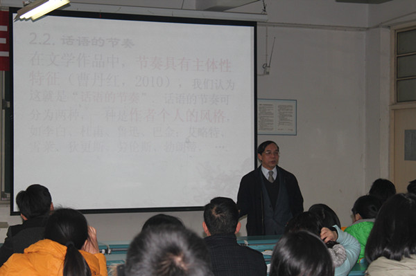 1月9日下午4点,应校科技产业处、外国语学院的邀请,华东师范大学教授、博士生导师张春柏教授在西区医教101教室为外国语学院教师作了题为“文学翻译中的节奏与韵律”的学术报告。外国语学院院长、党委书记石秀光主持了报告会,教学副院长程少武、科研副院长王宗华、行政副院长陶全胜与50多位教师一起聆听了报告会。