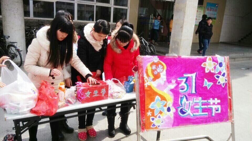 3月7日中午,外国语学院学生会女生部在西校区食堂门口举行女生节庆祝活动,关爱女生的自身思想素质、道德修养、文化内涵、业务能力和心理健康。