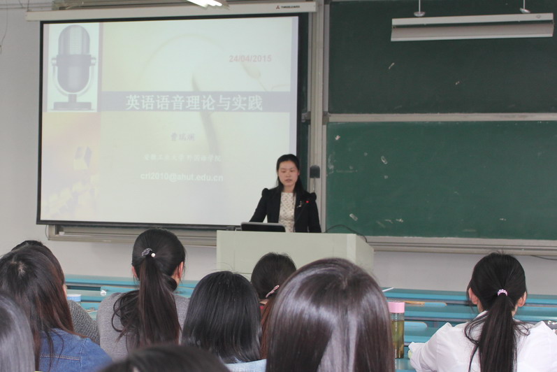 4月24日下午,受科技产业处和外国语学院邀请,安徽工业大学曹瑞斓博士在西区医教401教室作了题为《英语语音理论与实践》的讲座。讲座由学院教学副院长程少武主持,英语专业2012级全体学生聆听了讲座。