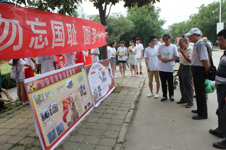 在南岭社区办公楼前,同学们把早已准备好的横幅、海报和展板放置整齐,开展“勿忘国耻 圆梦中华”的主题宣传活动,吸引了许多社区居民前来观看。同学们热情饱满地向居民们讲解抗战历史,共同重温抗战岁月,忆苦思甜,引起不少中老年人的共鸣。