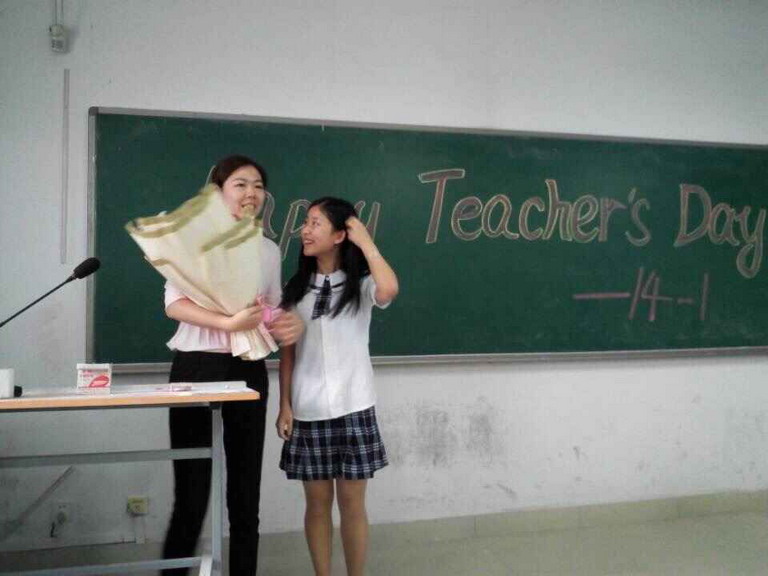沐浴着初秋的晨风,同学们早早地来到教室,端坐在座位上,黑板上书写着“Happy Teachers’ Day!”醒目的祝福语,讲桌上摆放着一瓶清透的矿泉水。当老师推门走进教室,同学们一同起立, “Happy Teachers’ Day!”,在整齐的祝福声中,班长把一束美丽芬芳的鲜花双手呈上,温馨的一幕让老师非常感动。“I am very happy. Thank you very much!”周宁老师激动地对英语2014-1班的学生们说道。在另一间教室里,温情同时上演,令郑大伟老师惊喜不已。