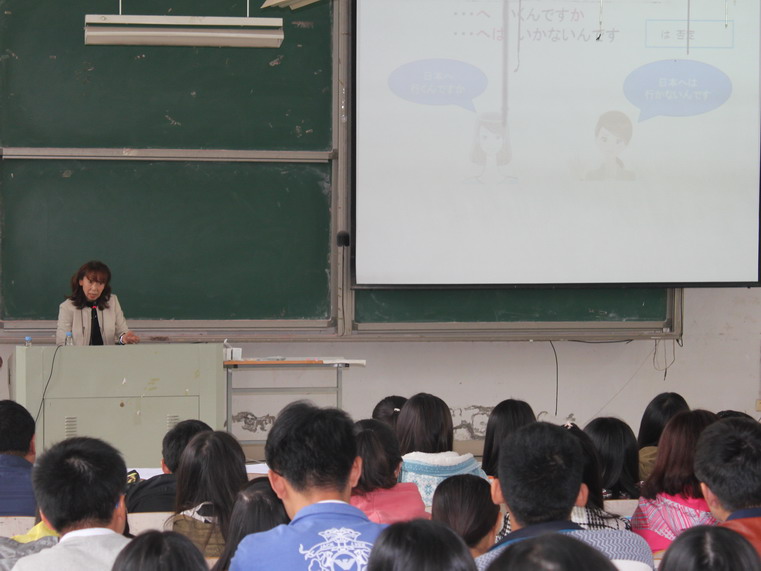 10月29日,应外国语学院邀请,日本国际教育学术交流协会理事、日本语教育专家海老原峰子女士在医教303教室作了题为《动词活用整体导入学习法》的讲座。外国语学院领导、日语系全体教师、各年级学生等100余人聆听了讲座。