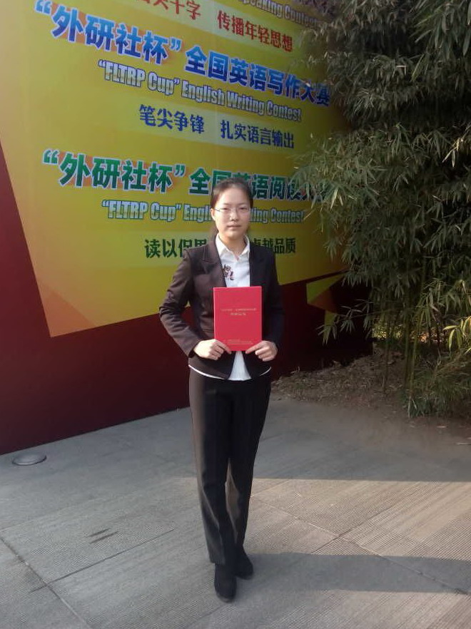 2015年10月,她参加了“外研社杯”全国英语写作大赛。她格外珍惜这个锻炼的机会,决心挑战自己的潜能。多少个午休,深夜和周末,她都坐在电脑前,在键盘声中构思,酝酿,斟酌。从省赛第二挺进全国赛,并最终拿下一等奖,站上领奖台的那一刻她告诉自己,所有的付出都是值得的。她相信,这样的一次参赛经历,享受这个过程和其中的收获,远比最后的结果更加珍贵。也正是这次机会让她认识到自己要努力的空间还很大。走出校园,她看到了一个更广阔的世界;与来自全国各地的优秀大学生同场竞技,她见识到了真正的“实力”和“优异”。