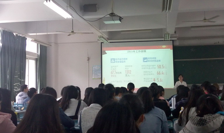 程秀霞以“2016年全国两会政府工作报告中的16大亮点”、“部长们两会记者会最该被记住15个民生问答”等问题为引,深入浅出地向同学们讲解。她指出,“两会”以发展为主题,以新理念把握发展新常态,以新追求开拓发展新境界,以新作为开启全面小康新征程,并不时与同学们进行互动讨论。