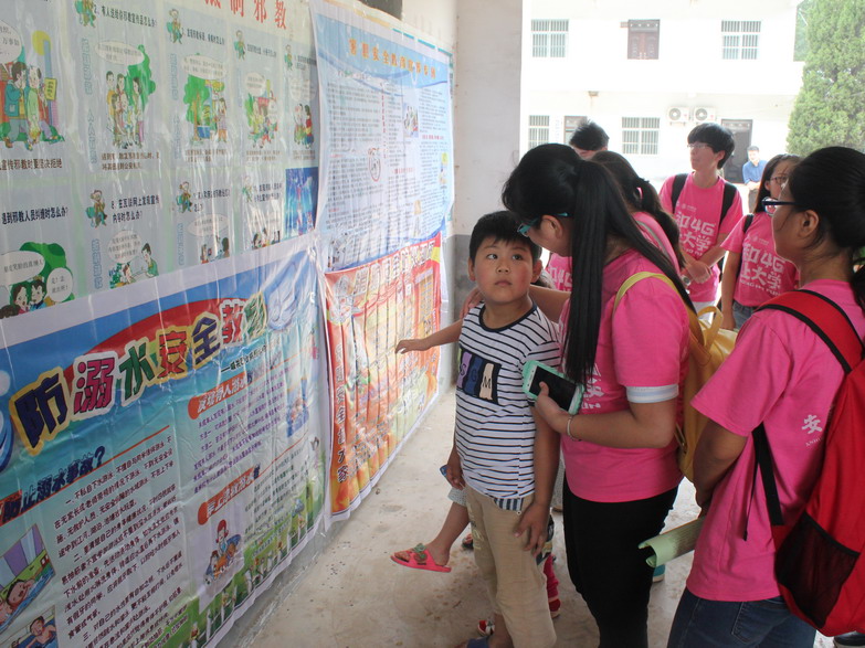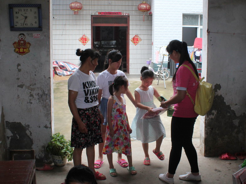 志愿者们在村书记的陪同下,走访了村中的困难家庭:陪老人们聊天,帮助他们打扫家庭卫生;看望儿童,并向他们赠送了书包和牛奶。随后,志愿者们在村委会的宣传栏粘贴海报,向儿童讲解安全知识常识。志愿者们温和亲切的态度、细致的服务,换来村民一张张真挚的笑脸。