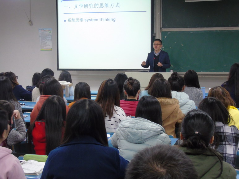 戚教授以日常生活中直觉和线性思维实例引入讲座主题,指出了培养和训练系统思维(System Thinking)和非线性思维(Nonlinear Thinking) 对文学学习和研究的重要性;接着,他以同学们比较喜欢的影视明星和电影电视剧为例,介绍了文学的发生模型以及文学与意识形态、文学与身份、文学与人格、文学与现实等相互关系。戚教授语言生动风趣,浅显易懂,讲座在轻松愉快的气氛中圆满结束,