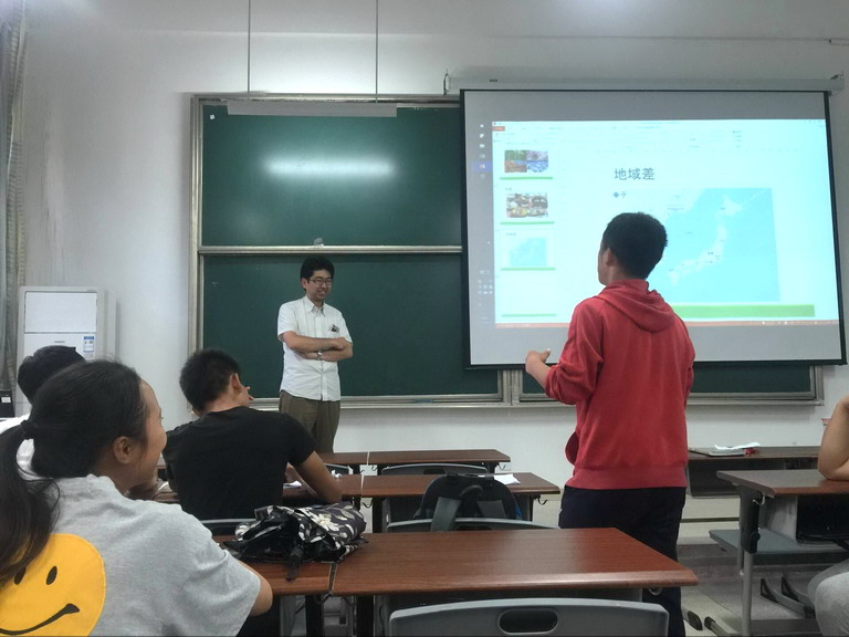 讲座围绕日本都市生活和乡村生活的中衣食住行的差异而展开,松崎公纪介绍了日本的四季和美景,并就如何学好日语提出参考意见。整场讲座内容丰富,生动有趣,同学们都听得津津有味并提出了许多有趣的问题,与松崎公纪进行了良好互动交流。