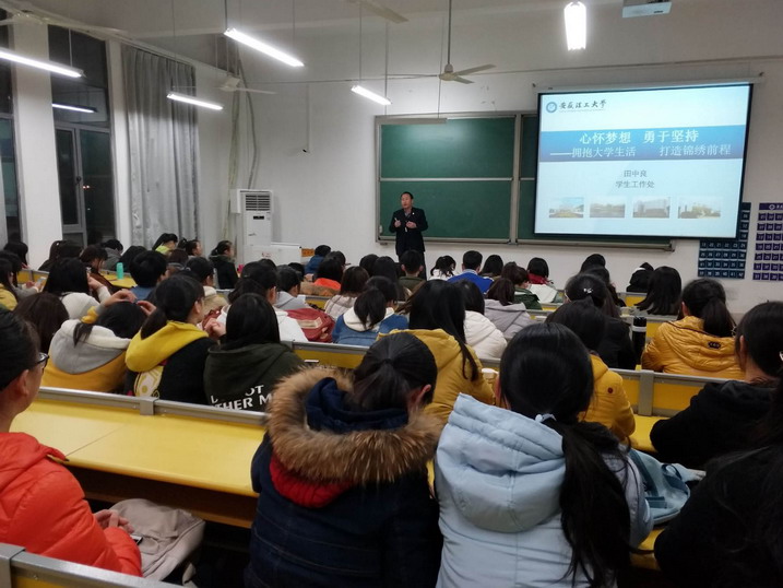 11月23日晚,外国语学院邀请校学生工作处处长田中良在明理北106教室为2017级新生作了题为“心怀梦想,勇于坚持”的讲座。讲座由学院党委副书记程秀霞主持,150名2017级本科生认真聆听了讲座。