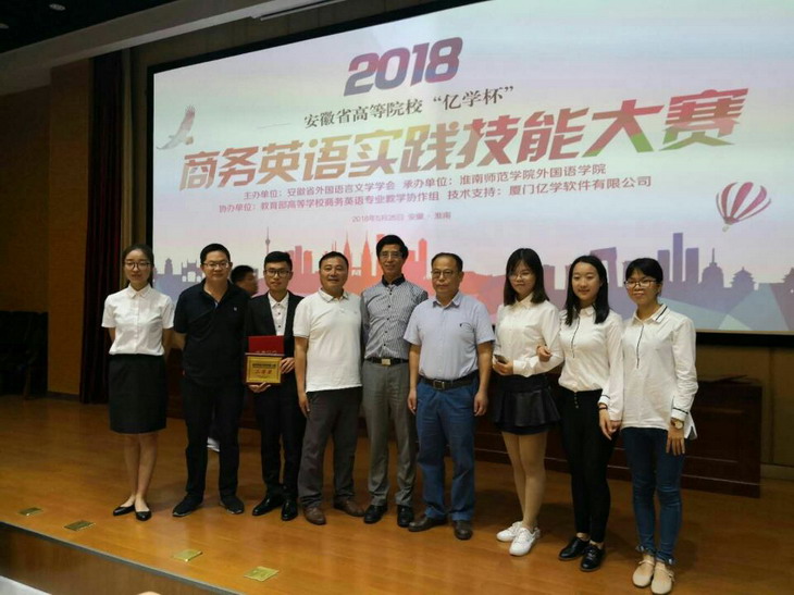 5月25至26日,安徽省第二届高校“亿学杯”商务英语实践技能大赛在淮南师范学院举行,我校英语专业(商务英语方向)叶体立等6名学生组队参加了比赛并获得了团体二等奖的好成绩。