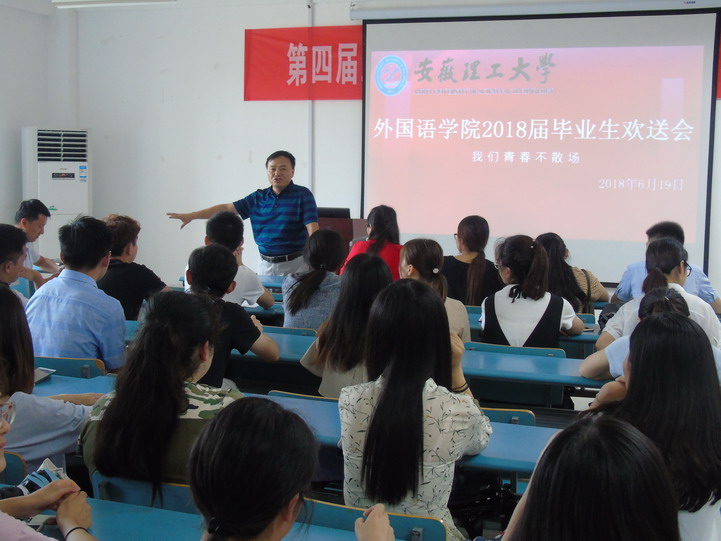 6月19日下午,外国语学院在崇智楼B233教室举行2018届毕业生欢送会。院党委书记石秀光代表学院向毕业生送上美好祝福与殷切期盼,院党委副书记、行政副院长(兼)彭晶,毕业班辅导员以及全体毕业生参加了欢送会。