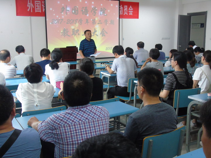 7月5日下午,外国语学院在崇智楼B233教室召开全体教职工大会。学校特聘教授陈纪梁作主题发言。
