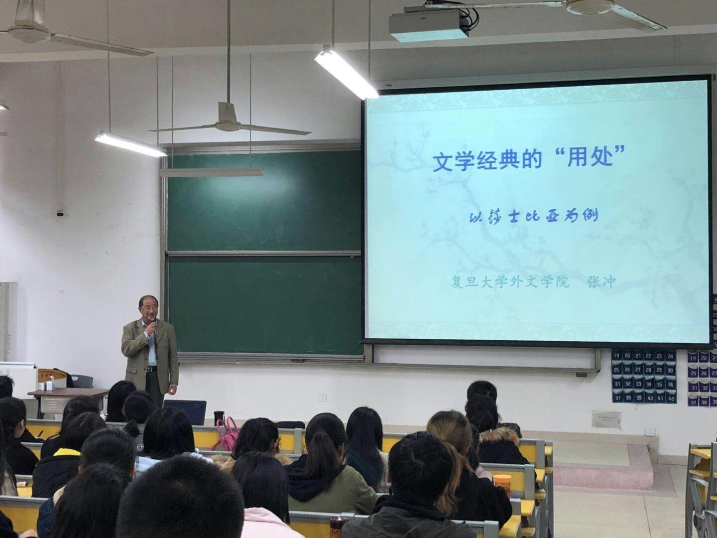 张冲以“‘文学经典的用处’——以莎士比亚为例”为主题,从谈 “用”与“处”入手,向学生指出:文学之用,乃为大用;文学之用,实为养人。他还以西方文化的两大源头之一——莎士比亚为例,论述了莎士比亚文学著作的经典之处——不在情节,而在“问题”;不在人物,而在“情感、情趣、情绪”,并引导学生细读了《威尼斯商人》、《一报还一报》、《雅典的泰门》、《罗密欧和朱丽叶》等戏剧精彩片段,同时对中国经典文学的困境与出路进行了反思。