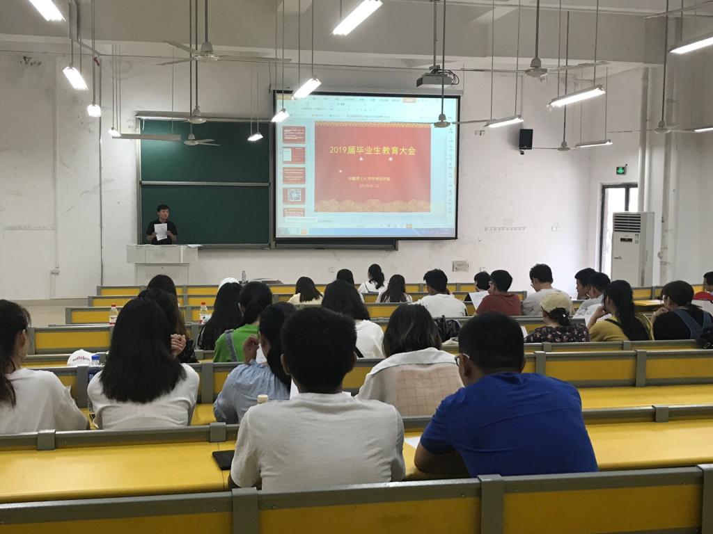 不说再见,青春启航。6月12日上午,外国语学院党委副书记(兼)行政副院长、2015级学生辅导员彭晶在明理楼105教室召开全体毕业生毕业教育和毕业欢送大会,代表学院为毕业生上了大学生涯的“最后一课”。他宣读了安徽理工大学校友会办公室《致2019届毕业班同学的一封信》和2019届省、校”双优生“表彰文件,通报了就业、升学先进班级名单,号召全体毕业生向身边的榜样学习,在离校前的最后一周时间里更加自觉地遵守学校的管理规定,努力做到“给母校留下完美印象、给低年级同学留下学习榜样、给自己留下美好回忆”;珍惜自己顺利毕业的成绩与光荣,准时参加毕业典礼和学位授予仪式,充分感受学校和学院的深情厚意;走出校门之后主动与所在地校友和校友会建立联系,在社会上始终胸怀忧国忧民之心、爱国爱民之情,以优异成绩向新中国成立70周年献礼。