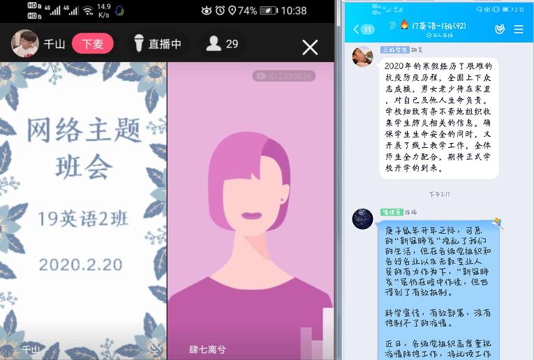 各班同学全部参加并分享了自己的学习状态、思想动态、生活情况,纷纷表示理解和配合学校采取的线上开学工作。对于学校“停课不停学”的举措,2019级英语1班孔德贤同学一句:“从未像现在这样渴望回校上课学习!”道出了同学们的共同心声,同学们在为学校新冠肺炎疫情防控举措点赞的同时也对各科老师化身“主播”的辛勤劳动表示感谢,纷纷表示将在做好疫情防控的同时制定好、执行好每天的学习计划。谈到当前的疫情防护工作,2017级3班袁理锋动情地说道:“相比于居家隔离的我们,最可爱的人是在前线与新冠肺炎抗击的医护人员和志愿者,正是有他们的无私付出,才有我们后方的的健康和安宁,这一切都会过去,加油武汉,加油中国!”。2016级学生党员施皖陵坚定地说:“感谢一路披肩斩棘、无所畏惧的最美逆行者,相信在党的坚强领导下,在全国人民众志成城,这场战疫终会胜利!”。