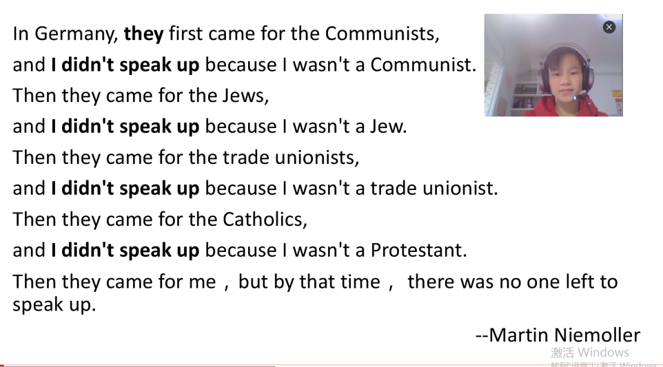 《英语演讲》是英语系结合社会发展形态和学生实际需要开设的专业课,旨在提高学生语言应用能力和逻辑思维能力,深受学生欢迎。肖婷、赖海琼、任华妮和张芳四位老师是该课程组骨干教师。在线上教学备课中,她们一方面精心钻研教材,一方面结合现实生活搜集各种网络资源。近期流行网络的抗疫情英文励志演讲“We Are All Fighters”是课程组选定学习题材,学生们不仅折服于演讲中的遣词用句,语音语调,更感动于疫情中“战士们”的真情和大爱。他们也积极创作属于自己的演讲,然后“上台”一人一段演讲给老师和同学们听。肖老师说,“学生练得用心,讲得用情,让我一次次感动。她们都敢于与当前的疫情引起的恐惧、未知、怀疑、自私、谣言、歧视、自卑、胆怯、被动等心理作斗争。”随着国内疫情的有效控制和国外疫情局势的加重,在英语演讲课的双语拓展材料中,四位老师认真选取学习强国、央视新闻客户端的习近平总书记的权威讲话和疫情防控新闻报道,从多角度选取材料,凸显国内医务工作者、各条战线的工作人员的舍家为民和大爱无疆,以此让学生在英语专业知识、演讲沟通技能、培养生命健康、国际友爱的意识等方面得到多重提升。