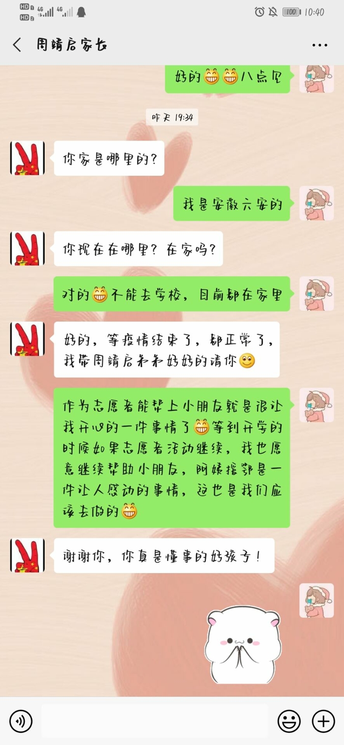 “Twinkle,twinkle,little star,骁勇小朋友,你准备好了吗?我们的英语绘本课开始啦!今天雨昕姐姐要给你讲的是《播种好习惯》的故事.......”这是家住山西太原的外国语学院英语专业志愿者李雨昕的线上课程开场白。袁骁勇是一位还在幼儿园中班的5岁小男孩,他的爸爸袁晨是淮南东方医院集团总院驰援武汉疫情防控的淮南医疗队医生。在妈妈的帮助下,袁骁勇每天坚持晚上七点半准时和李老师在网上见面,读英文绘本、学英文歌曲、讲故事、记单词成了他们最开心的沟通方式。由于骁勇年纪小,李雨昕每天坚持备课,自制40页的教学PPT,为了把自己认为最好的教材准备好,甚至把自己的弟弟拿来做“练习”,反复琢磨,找准5岁孩子最感兴趣的切入点,让她的网上小课堂变成了一个既有温度又长学识的“爱心加油站”。