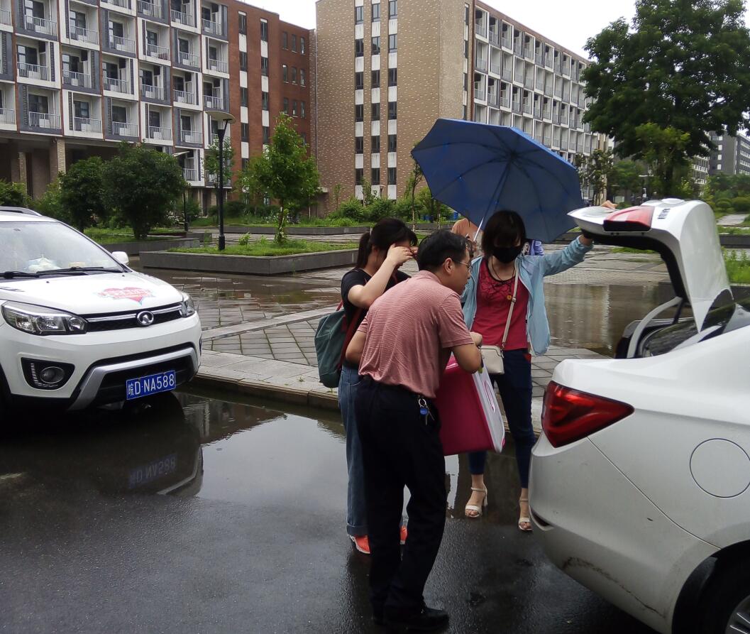 6月28日上午,一场始料未及的大暴雨给全校最后一批返校毕业生离校造成了极大的不便。但是,从淮北市濉溪县返回学校收拾行李的外国语学院2016级英语专业亓笑宇同学却在爱苑1号女生宿舍楼前惊喜地看到了带过自己专业课的赵敏、郑大伟、王化菊等老师。他们撑起雨伞走向亓笑宇,并一起帮她把行李装上了贴有“毕业生离校接送”标牌的私家车后备箱,短暂在合影、话别之后,就把她和行李一起送到了学校南门,挥手再见时,她的心里感到暖暖的。