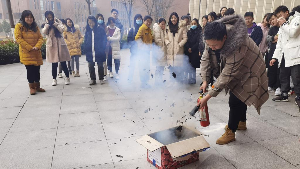 随后,董如梦老师在户外讲解了实验室火灾的预防、火灾自救及逃生方法等消防安全基本常识,演示了灭火器的使用操作方法,并在现场设置模拟起火点,指导学生使用灭火器进行灭火。同学们仔细观看效仿,迅速将起火点扑灭。