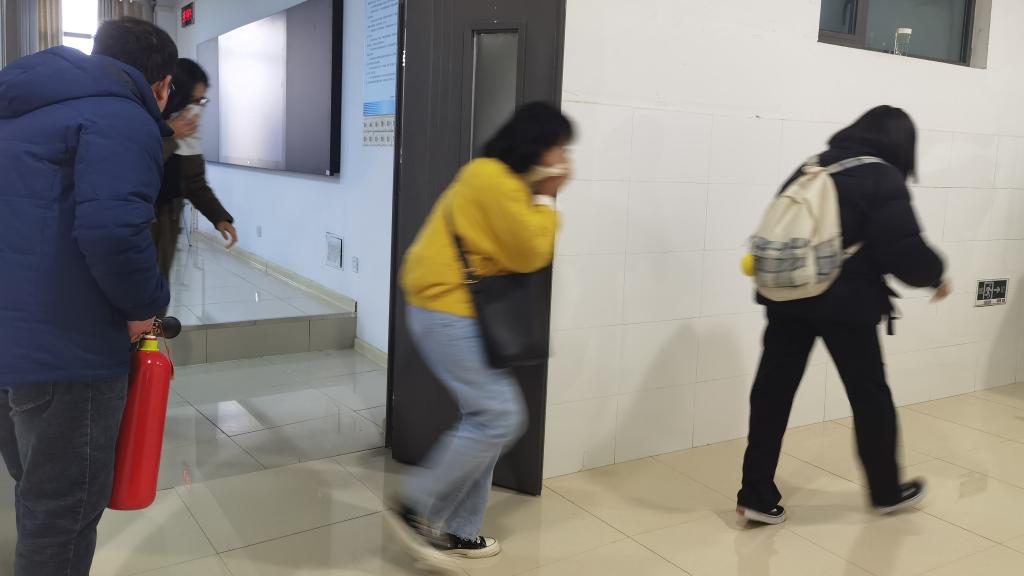 活动中,外语自主学习中心董如梦老师为参与演练的同学讲解了语言实验室常见的电气火灾事故诱因,普及安全用电常识和应急避险知识,指导同学们如何在火灾发生后浓烟四起的场所内使用手边的工具进行逃生以及逃生过程中的注意事项。随后,伴随着警报声想起,同学们用湿毛巾捂住口鼻,按照指定的安全逃生路线,有序、迅速地安全撤离到户外安全地点并清点人数,顺利完成疏散逃生演练。