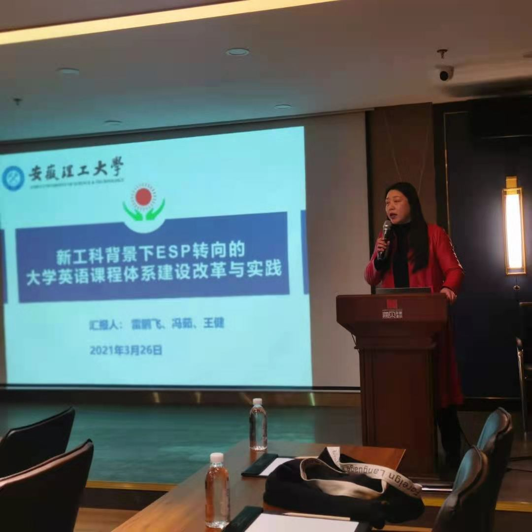 本次论坛由教育部高等学校大学外语教学指导委员会、上海交通大学和上海外国语大学主办,上海外语教育出版社承办,安徽理工大学外国语学院和淮南师范学院外国语学院协办安徽省线下分会场。论坛采取线上线下相结合的方式进行。在线下交流环节,公外一系主任冯茹副教授代表安徽理工大学做了题为《新工科背景下ESP转向的大学英语课程体系建设改革与实践》的主旨发言,向与会专家代表介绍了学院近年来进行的ESP教学改革过程及所取得的成果,受到了与会代表的高度赞扬和关注。他们表示,安徽理工大学外国语学院所进行的改革实践是谋求大学英语教学发展出路的有益探索,具有很好的实践示范意义。冯茹副教授还就代表们关心的问题进行了解答,并诚挚邀请安徽省高校的大学英语教学同行教师来校深入交流。