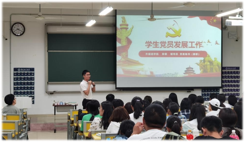2019级辅导员秦镇为新生介绍学生党员发展程序(摄影:马鑫雅)