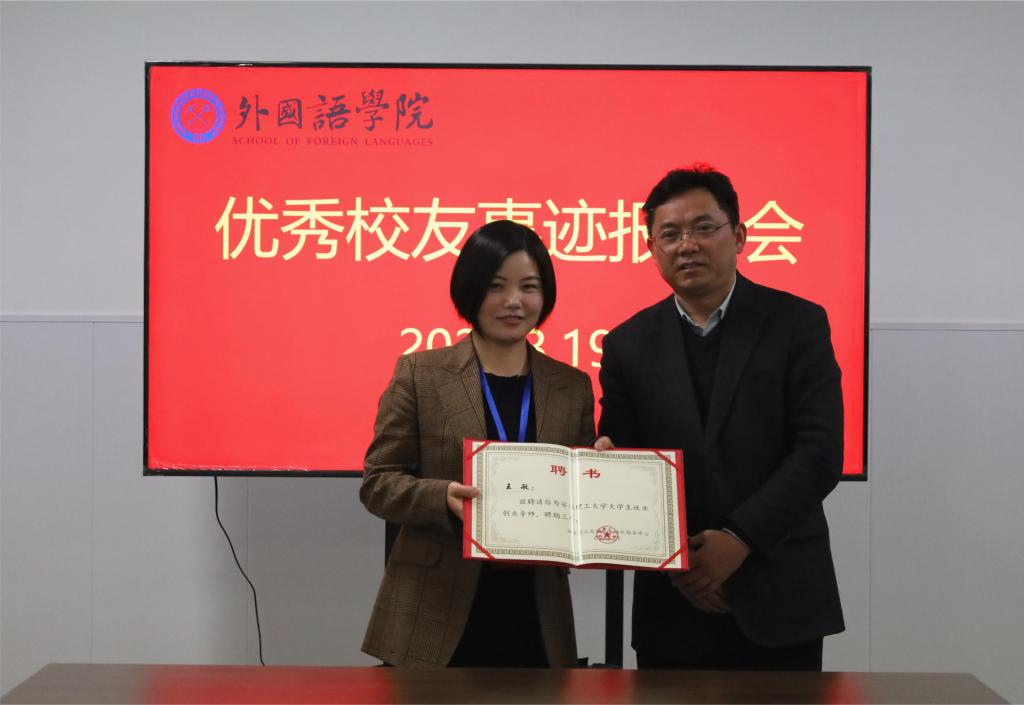 3月19日上午,在学校校友会换届大会暨校友论坛系列活动间隙,学院邀请优秀校友2009届英语专业毕业生、杭州得贝工艺品有限公司总监王敏回到母校与师生座谈交流,并受聘担任校大学生就业创业导师。