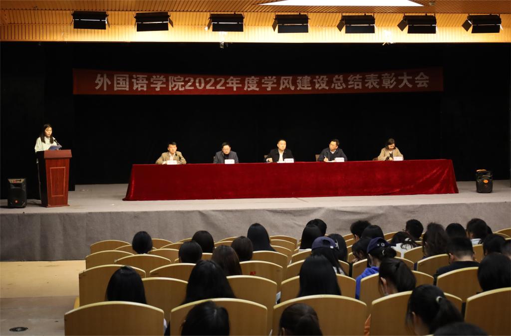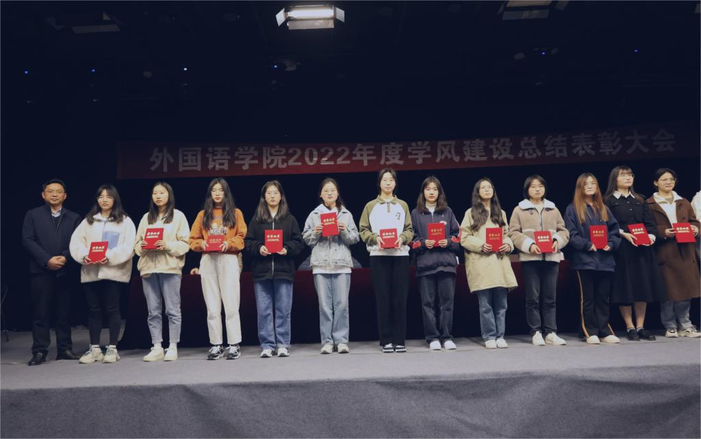 会议还现场表彰了2022年度“新时代文明实践之星”和获得校级以上各类荣誉与奖项的学生,学院党政班子成员分别为获奖学生颁奖。3位受表彰奖励的先进个人、先进集体代表分别作了个人学习和班级工作经验交流发言。外国语学院2022年度红歌比赛获奖班级英语2021-4班全体同学现场表演了合唱《如愿》,表达了全院师生的美好祝愿。