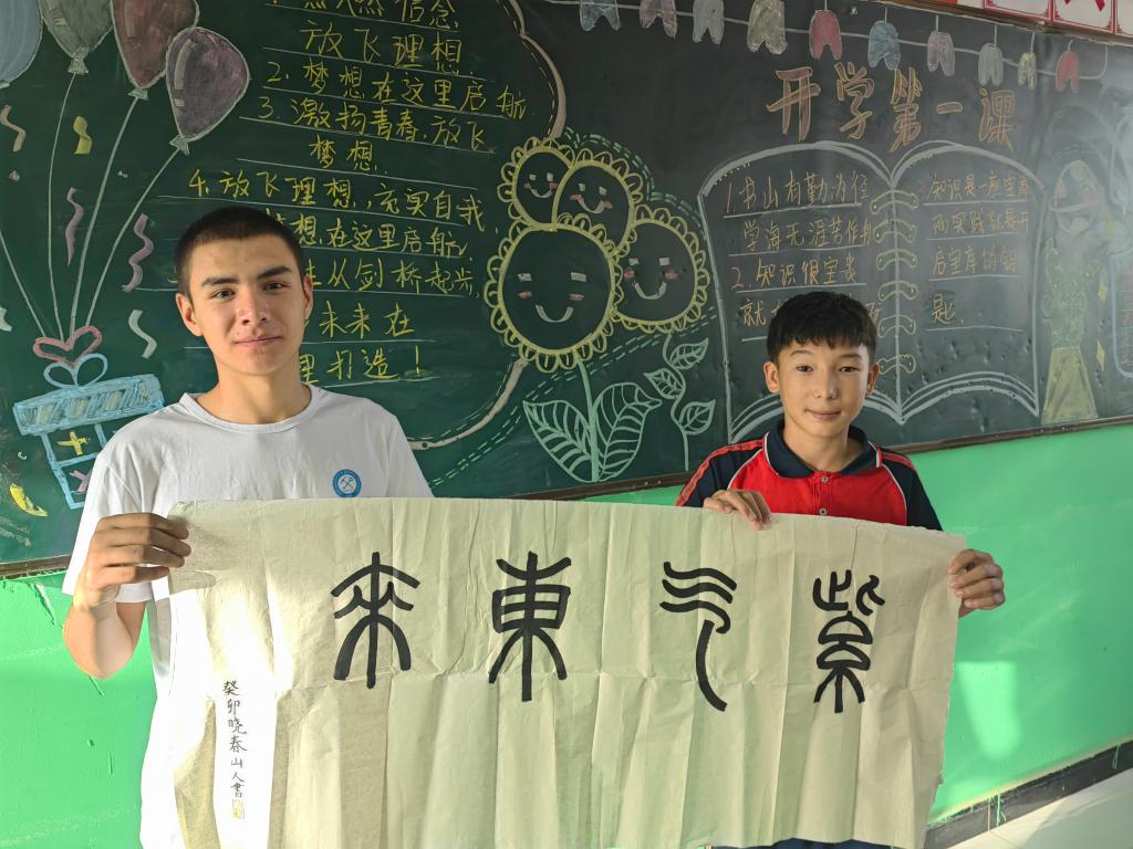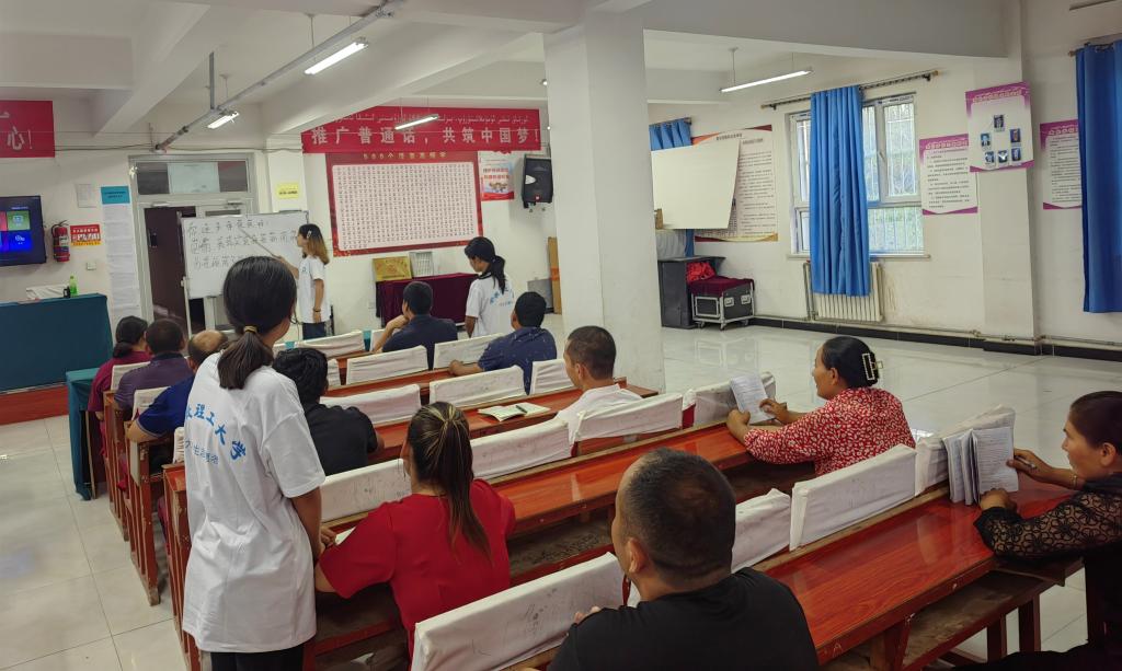 8月3日至7日,实践团队前往和田地区洛浦县恰尔巴格镇吉米亚村开展推广普通话系列活动。在村农民夜校农民讲习所,团队成员从汉语拼读入手,通过图画、汉字等方式,共同为夜校学员开设《日常交流用语》课,结合当地学员实际需要,打造出“阳光推普”特色课程——以“写好规范字”为主线,将绘画与书法相结合开展“推普+书画”课堂,呈现汉字之美。为更好地满足当地的语言咨询需求,团队成员在吉米亚村专门设置“推普振兴乡村驿站”,发放“双语”推普宣传手册500份,用易懂易学的方式拓宽当地少数民族群众日常用语词汇量,助力语言文字走进千家万户,促进各民族人心归聚、精神相依,服务区域经济社会协调发展、团结奋斗、共享繁荣。