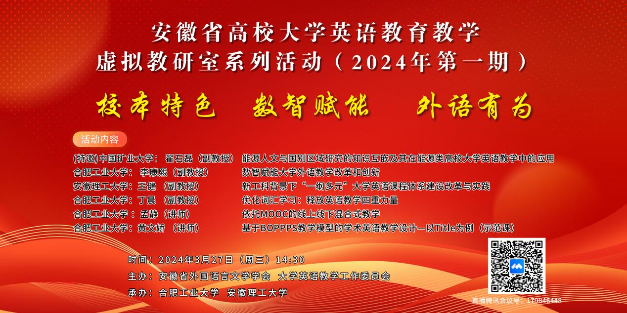 3月27日,以“校本特色、数智赋能、外语有为”为主题的安徽省高校大学英语教育教学虚拟教研室系列活动在线上举行。本次活动由安徽省外国语言文学学会和大学英语教学工作指导委员会主办,学院和合肥工业大学外国语学院联合承办。外国语学院全体教师参会,省内各院校近200名外语教师云端同步参会,院长雷鹏飞主持闭幕式,副院长李争主持第一阶段主旨报告会。