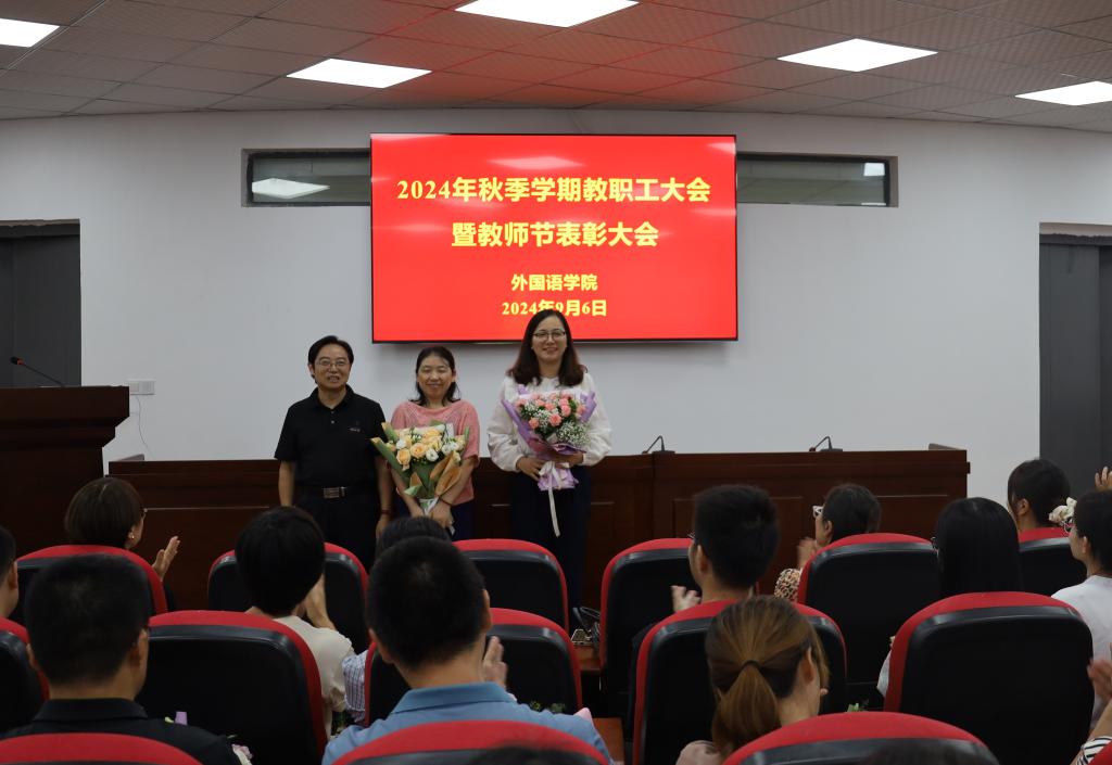 学院党委主要负责人宣读表彰文件,依次表彰了外国语学院青年教师教学竞赛获奖人员、优秀教学质量奖获奖人员和师德先进个人等荣誉获得者。学院领导分别为受表彰人员颁发荣誉证书,学生代表送上鲜花。