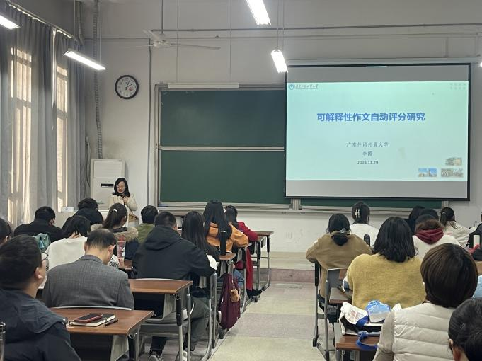 11月29日下午,应外国语学院邀请,广东外语外贸大学博士生导师李霞教授在明理北103为学院师生带来“可解释性作文自动评分研究---兼谈外国语言文学师生计算思维培养和国家级基金申报”的学术讲座,学院师生共计100余人参加,讲座由学院副院长周宁主持。
