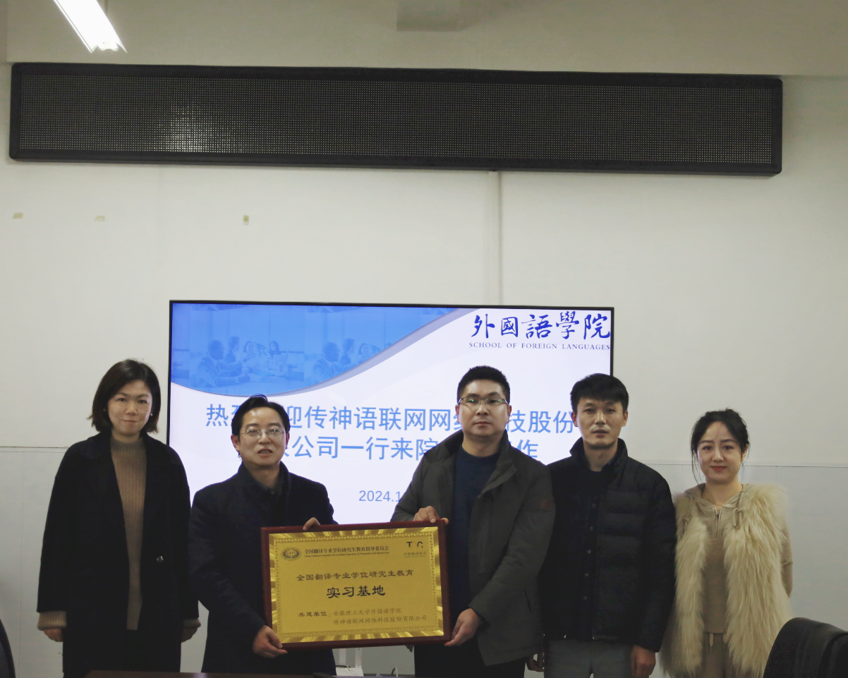 12月5日下午,学院在崇智楼B203会议室举行实习基地授牌仪式,传神语联网网络科技股份有限公司总经理张华、教育事业部培训经理向袁媛、传神联合(合肥)信息技术有限公司经理凤凯一行人、院长雷鹏飞、副院长周宁参加仪式。会上,双方就产教融合的深化、课程共建、学生实习实践以及产业学院建设等关键议题进行了深入交流与探讨。