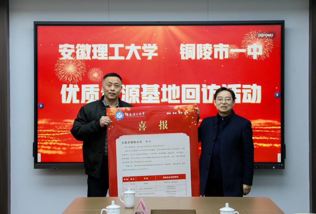为加强与高中优质生源基地的联系,1月10日,外国语学院院长雷鹏飞一行三人前往铜陵地区开展优质生源基地回访工作并送喜报,受到铜陵中学、铜陵市第一中学等7所优质生源基地校领导、老师们的热烈欢迎。