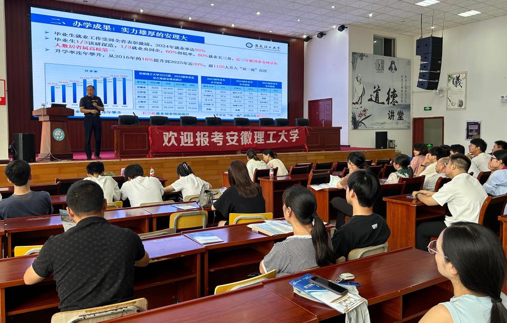 在铜陵一中、铜陵三中、铜陵中学、枞阳中学等学校,王先江分场次进行深入详实的招生宣讲,他围绕“创建双一流的安理大、实力雄厚的安理大、邀您加盟的安理大”等主题,从辉煌校史沿革到新时代跨越发展,从A类学科建设到国家级科研平台,从创新人才培养模式到智慧校园生态构建,多维度展示了学校高水平大学的综合实力。招生工作组针对志愿填报策略、专业录取规则等考生关切问题提供个性化报考指导,现场发放的智能报考指南手册引发热烈反响。各中学负责人高度认可学校“三全育人”培养体系,表示将共建优质生源输送长效机制,携手打造高水平教育共同体。