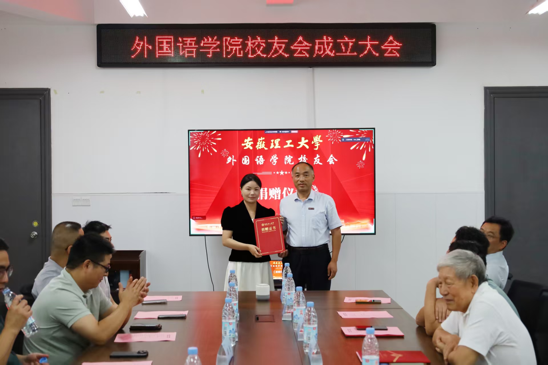 会议现场,英语专业2003级余林、2004级黄木森、2005级王敏三位校友总共捐赠20万元助力学院建设与发展。英语专业2003级校友、安徽卡卖客国际贸易有限公司创始人余林代表捐赠校友动情表示:“无论走得多远,外国语学院始终是我们梦想起航的港湾。希望通过校友会平台,让更多校友反哺母校,助力学院建设,共谋发展大计,绘就美好蓝图。”