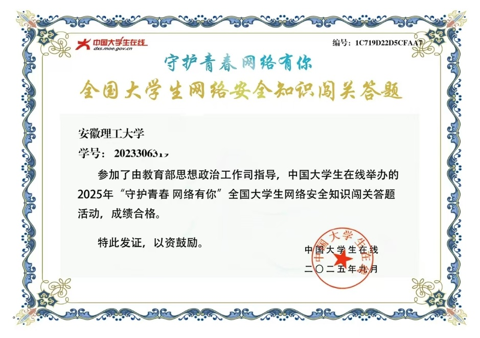 9月15日-16日,学院组织14个班级约330余名学生,全员参与“守护青春,网络有你——2025年全国大学生网络安全知识闯关答题活动”,学院关工委成员主动配合学院学工队伍做好答题动员与督促工作,助力实现学生全员参与。据统计,全院学生答题参与率达100%,平均正确率超92%,其中英语22-1、英语22-4、英语23-1、英语23-3、英语24-1、英语24-2班正确率均为100%,排名前列,充分体现出学生对网络安全知识的扎实掌握。